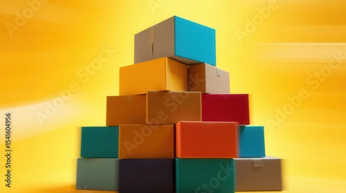 Colorful Boxes Stacked Against Bright Yellow Background, Creating a Pyramid Shape with Shipping Packages.
