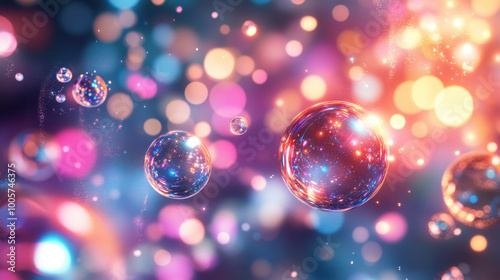 Colorful bubbles float in dreamy background filled with vibrant bokeh lights, creating magical and whimsical atmosphere. interplay of colors adds sense of joy and wonder