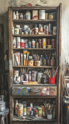 Colorful Cabinet Filled with Art Supplies and Brushes