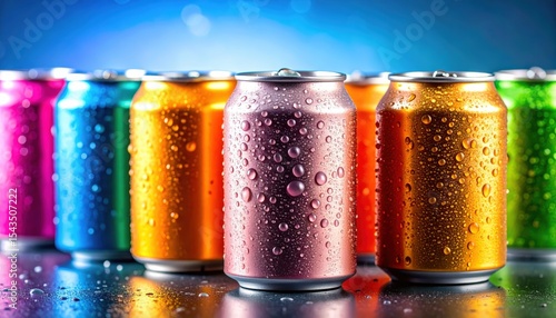 Colorful Cans with Water Drops: A vibrant row of various colored aluminum cans, each covered in glistening water droplets, are illuminated by a blue backlight, emphasizing refreshment.