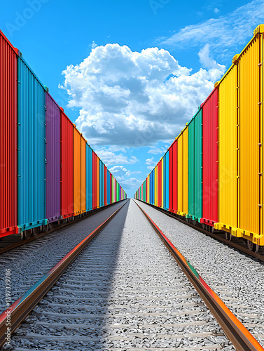 Colorful cargo containers line converging train tracks under a bright blue sky with a puffy white cloud.