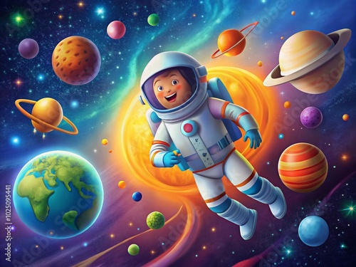 Colorful Cartoon Spaceman Exploring Outer Space with Planets, Stars, and a Rocket Ship Background