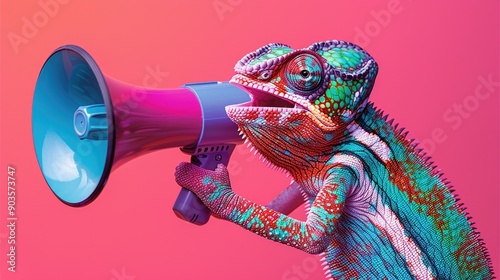 Colorful chameleon holding a megaphone, with vibrant patterns and hues against a pink background. The image is striking and playful, showcasing the chameleon's unique ability to change colors.