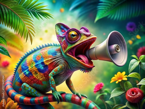 Colorful Chameleon with a Megaphone Spreading Joyful Messages in a Vibrant Fashion Photography Setting