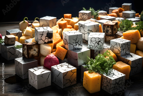 Colorful cheese display with cracked cube presentation for a gourmet event