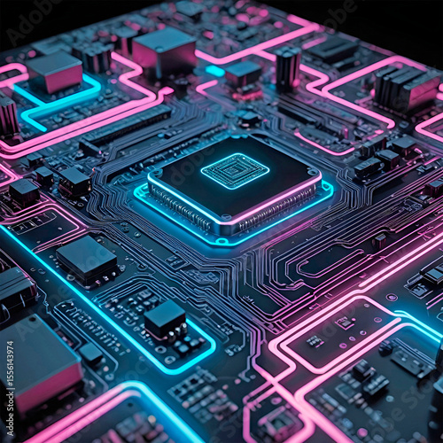 Colorful circuit board with glowing blue and pink lines and components
