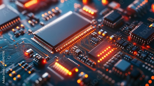 colorful circuit board with microchips and electronic components, representing the cutting-edge of technology and innovation in digital systems and hardware engineering