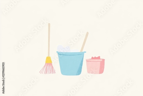 Colorful Cleaning Tools with Buckets and Broom in Soft Style
