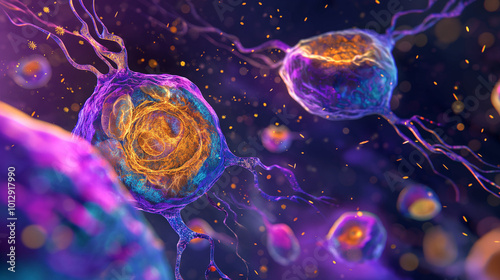 Colorful close-up view of cells and neurons under a microscope showcasing intricate details and vibrant structures in a laboratory setting
