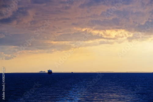 Colorful cloudy sky above sea and wake from cruise ship at sunset