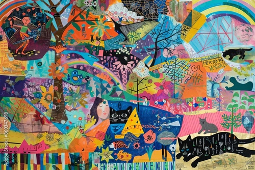Colorful Collage with Abstract Art and Animals in Rainbow Palette