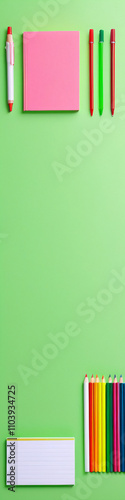 colorful collection of child stationery against a light green background, perfect for adding text or integrating into educational advertisements.
