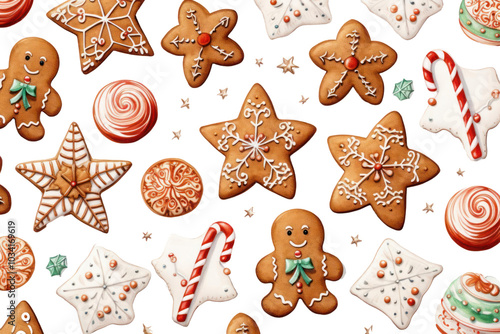 Colorful collection of festive gingerbread cookies in various shapes and decorations on a white background.