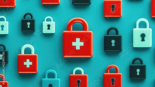Colorful Collection of Locks with Medical Symbols on a Teal Background