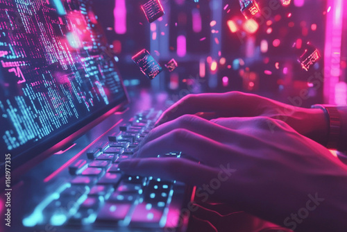Colorful Computer Coding Scene With Illuminated Keyboard and Digital Data Representation