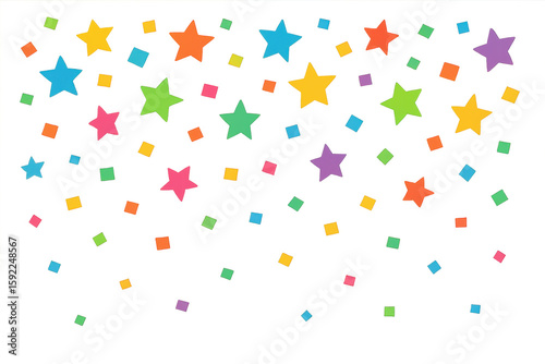 Colorful confetti and stars are falling on a transparent background, creating a festive and celebratory atmosphere