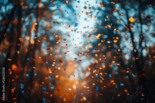 Colorful confetti falls through trees in a serene forest during sunset celebration