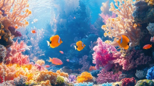 Colorful coral reef scene with a variety of vibrant sea fish swimming among the corals, showcasing their natural beauty -