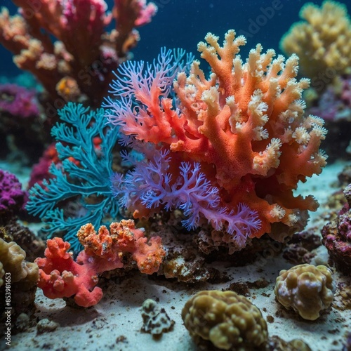Colorful corals in a coral reef underwater with beautiful lighting. Generative AI.