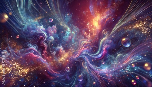 Colorful cosmic abstract background with flowing liquid shapes, glowing particles, and swirling energy