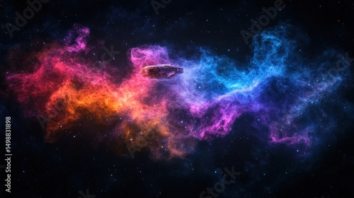 Colorful Cosmic Nebula with a Spaceship in the Vast Universe