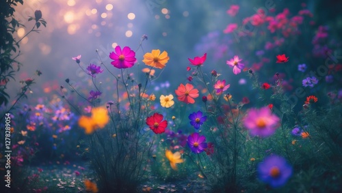 Colorful Cosmos Flowers Blooming in a Magical Blurred Garden with Fog and Soft Lighting Creating a Dreamy Atmosphere