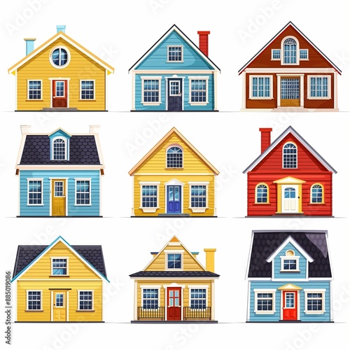 Colorful Cottage Style Houses Illustration - Front View Renderings of Charming Homes with Different Designs and Colors