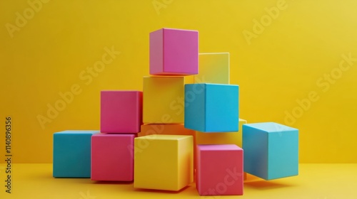 Colorful Cubes on Yellow Background: A vibrant 3D rendering of stacked cubes in various colors, creating a playful and modern aesthetic.