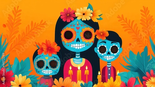 Colorful Day of the Dead Family Altar with Vibrant Flowers and Candles - Flat Design Illustration