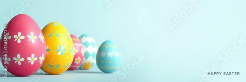 Colorful decorated Easter eggs arranged on a light blue background with festive patterns for celebration