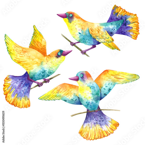 Colorful decorative birds with tail and wings watercolor hand drawing isolated on white