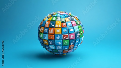 Colorful digital globe made of app icons representing connectivity and technology in a vibrant blue background.
