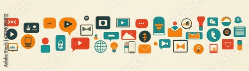 Colorful Digital Icons and Symbols Representing Communication, Technology, Media, and Connectivity in a Creative Horizontal Composition on a Light Background