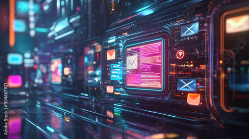 Colorful digital interface displaying various notifications and messages in a futuristic environment