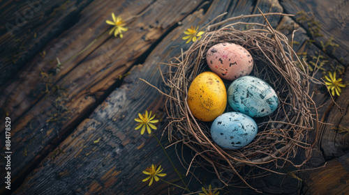 Colorful Easter eggs in a bird's nest on a rustic wooden backgro