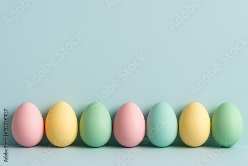 Colorful Easter eggs in a row, placed on a grassy field, with a backdrop of blooming flowers and clear blue sky.