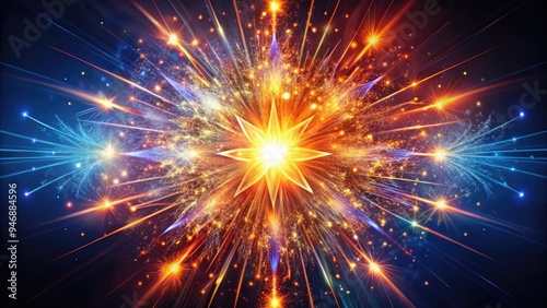 Colorful explosive sparks and flames erupt from a stylized starburst shape, formed by intricate trails of light, against a dark background with subtle gradient.