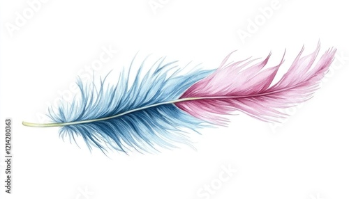 Colorful feather with blue and pink hues, gracefully lying on a white background, ideal for creative projects
