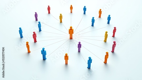 Colorful figures of people interconnected by lines create visual representation of teamwork, networking. Central figure stands out among many individuals leadership, connection. Illustration shows