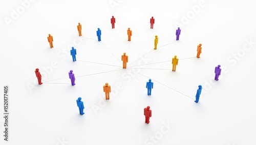 Colorful figures of people interconnected by lines create visual representation of teamwork, networking. Central figure stands out among many individuals leadership, connection. Illustration shows