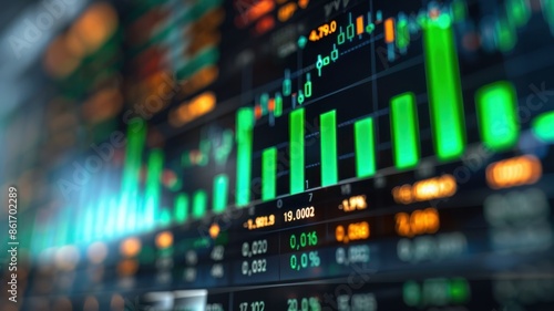 Colorful financial graph charting stocks and market data on a digital screen, illustrating economic trends and investment analytics.