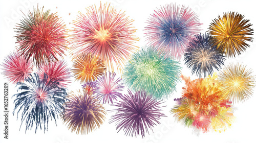 Colorful Fireworks Burst Set with Multiple Vibrant Explosions on Transparent Background
