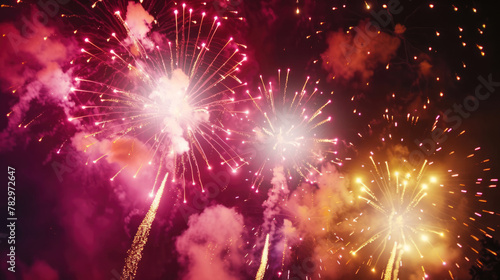 Colorful fireworks display on night sky background. Pyrotechnics show, sparks and glow