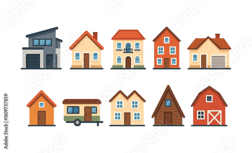 Colorful flat style house collection featuring modern, classic, and rustic designs