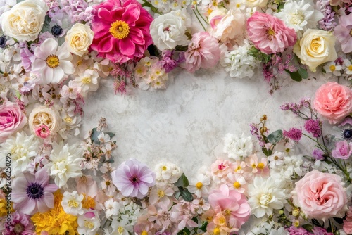 Colorful floral composition with various blossoms creating a vibrant arrangement on a light background. Generative AI