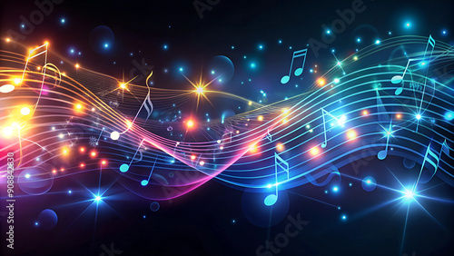 Colorful Flowing Music Notes on Dark Background, Dynamic Melody Concept