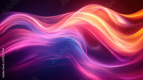 Colorful flowing waves of light create an abstract background with vibrant hues of pink, orange, and blue