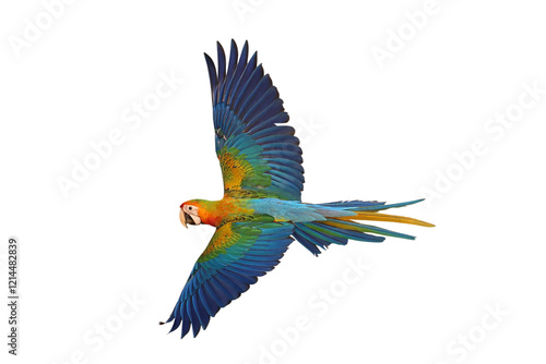 Colorful flying Camelot Macaw parrot isolated on transparent background png file