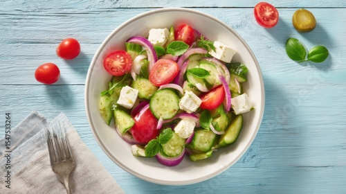 Colorful fresh salad in white bowl with sliced cucumbers, cherry tomatoes, red onion, feta cheese, and basil leaves on light-blue wooden surface.
