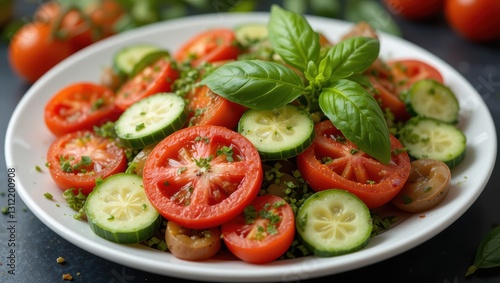 Colorful Fresh Salad with Sliced Tomatoes, Cucumbers, and Basil on a White Plate